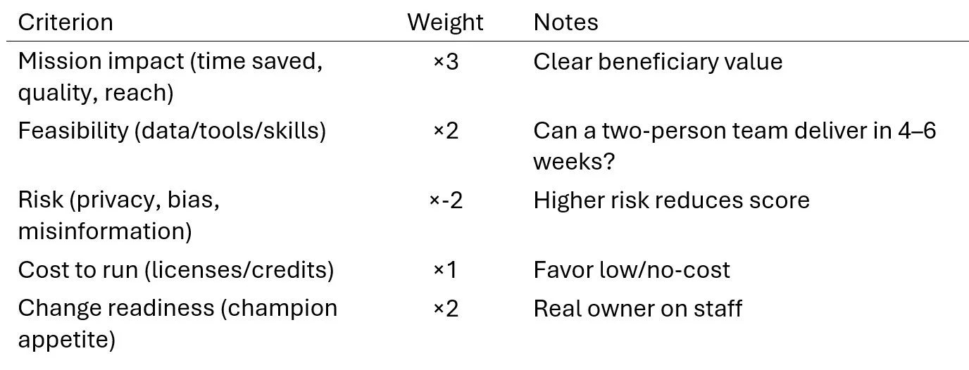 o Collect ideas from staff; score by impact, effort, risk, mission‑fit.